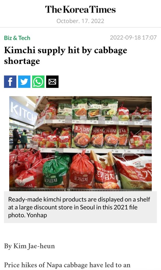 Fri 14 Oct 2022, Day 32/61, 3/4. A shortage of napa cabbage (‘chinese leaf’) this year in Korea has led to many households not making their own gimchi but buying it ready-made. https://www.koreatimes.co.kr/www/tech/2022/10/129_336237.html