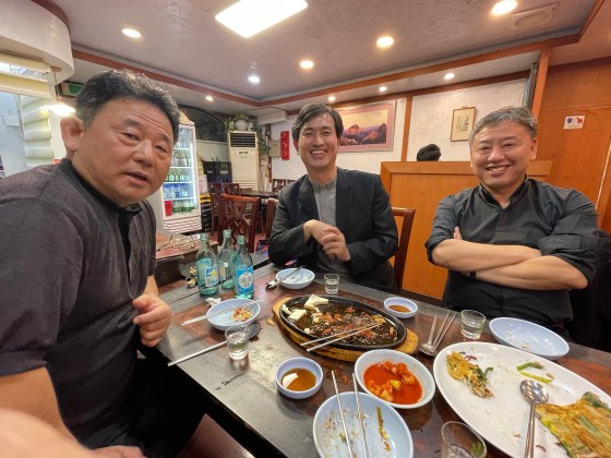 Thu 8 Oct 2022, Day 24/61. After the meal a drink (or two) with local clergy. Soju, 소주, is usually the drink of choice, accompanied by gimchi, 김치, & other side dishes. Soju was never missing during my many late night conversations in Osan.